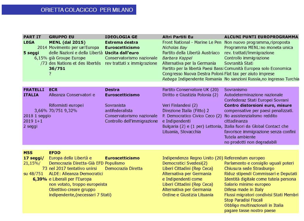 Dalle tavole predisposte balzano all’occhio il numero dei seggi per l’Italia e per il Gruppo Europeo, le percentuali relative ottenute nel 2014. 73 sono i seggi che spettano all’Italia, 76 quando e se si chiuderà la Brexit, per inciso ieri si è dimessa Teresa May.