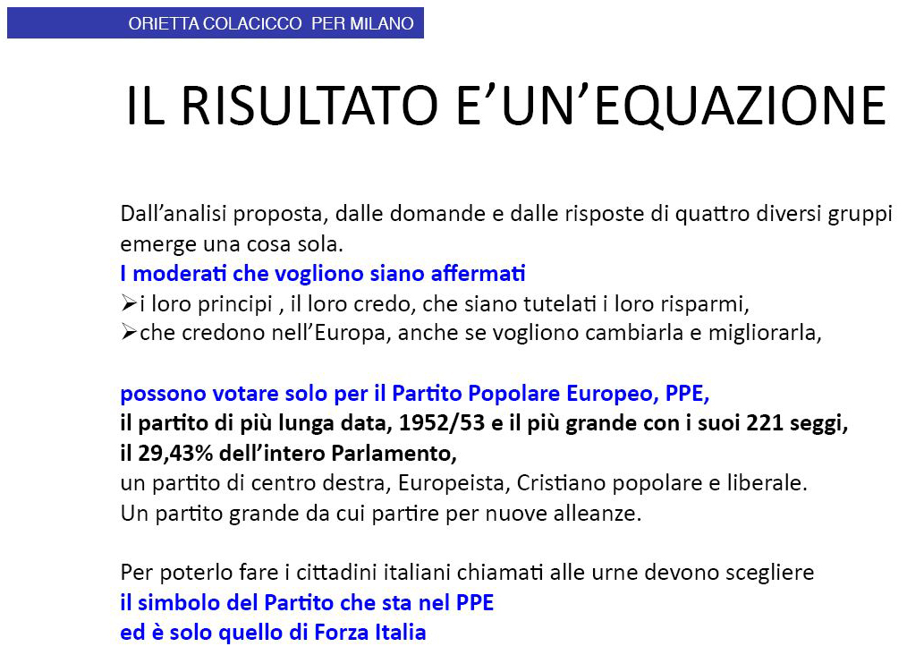 Dall’analisi emerge una cosa sola. I moderati che vogliono siano affermati i loro principi, il loro credo, che siano tutelati i loro risparmi, che credono nell’Europa, anche se vogliono cambiarla e migliorarla, possono votare solo per il Partito Popolare Europeo, PPE, il partito di più lunga data, 1952/53, e il più grande con i suoi 221 seggi, il 29,43% dell’intero Parlamento, un partito di Centro destra, Europeista, Cristiano popolare e liberale.