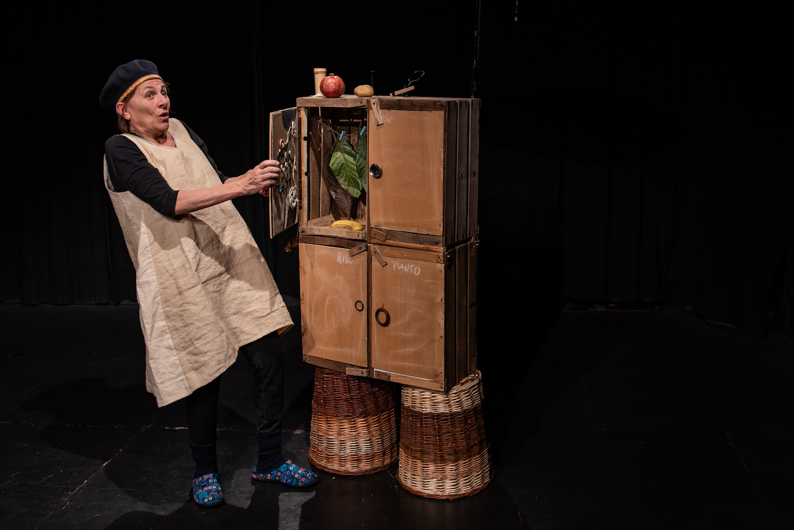 Lo spettacolo, che vuole stimolare la fantasia e l’immaginazione del pubblico, trae spunto dall’osservazione della natura circostante fatta di elementi riconoscibili (come foglie, fiori, frutta e verdura) e trasportati in un universo sensibile in cui i sensi, in particolare la vista, creano assonanze con un mondo altro. Frutta e verdura assumeranno così nuovi significati: la banana diventerà una luna nel cielo, un peperone rosso diventerà il naso della protagonista, le foglie si trasformeranno in ali…