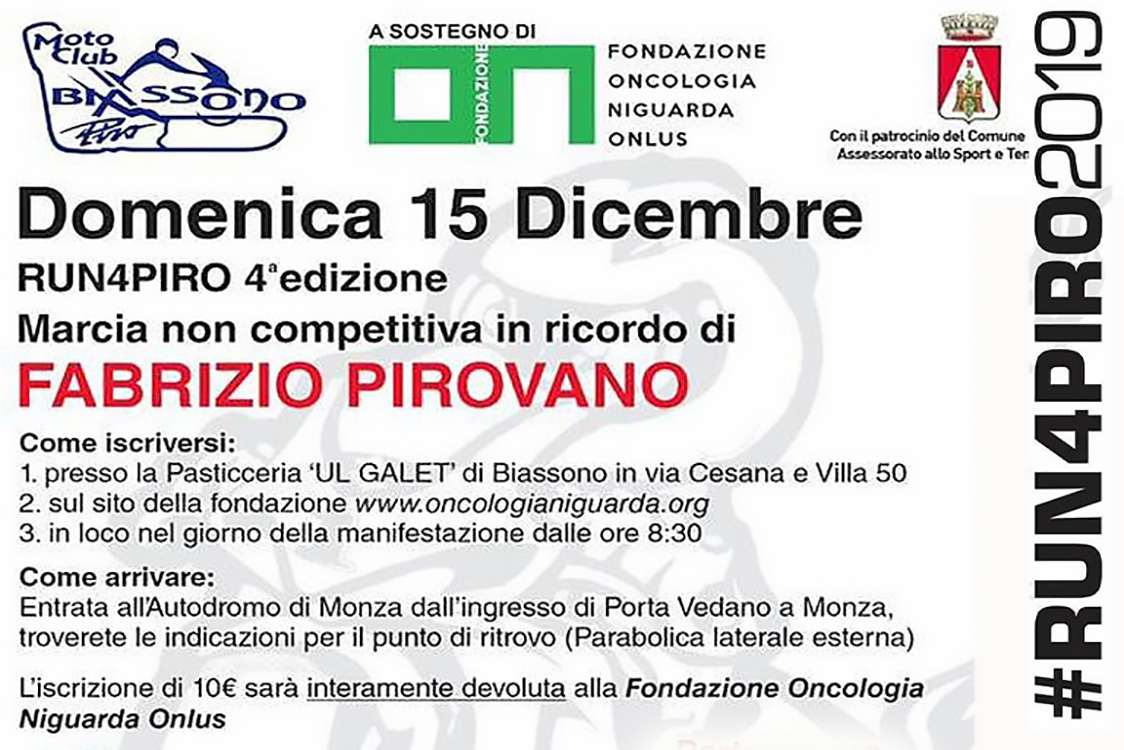 Una corsa solidale in memoria di Fabrizio Pirovano. Domenica 15 dicembre il Monza Eni Circuit ospiterà la quarta edizione della marcia non competitiva Run4Piro in memoria del campione monzese di motociclismo. Il ritrovo è alle 8:30 nell’area Parabolica. L’iscrizione all’evento ha un costo di 10 euro a persona che saranno interamente devoluti alla Fondazione Oncologia Niguarda Onlus. Tre i percorsi tra cui scegliere, con partenza alle 9.30: 2,5 km, 5,8 km e 11,6 km. I primi 1000 iscritti riceveranno in omaggio una t-shirt commemorativa. Al termine dell’evento verrà offerta una fetta di panettone a tutti i partecipanti. Per maggiori informazioni: www.oncologianiguarda.org.