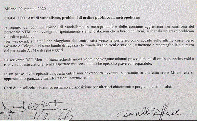 La scrivente RSU Metropolitana richiede nuovamente che vengano adottati provvedimenti di ordine pubblico volti a risolvere queste criticità, senza aspettare che accada qualche episodio grave ed irreparabile. In un paese civile episodi di questa entità non dovrebbero avvenire, soprattutto in una città come Milano che si appresta ad organizzare manifestazioni internazionali.