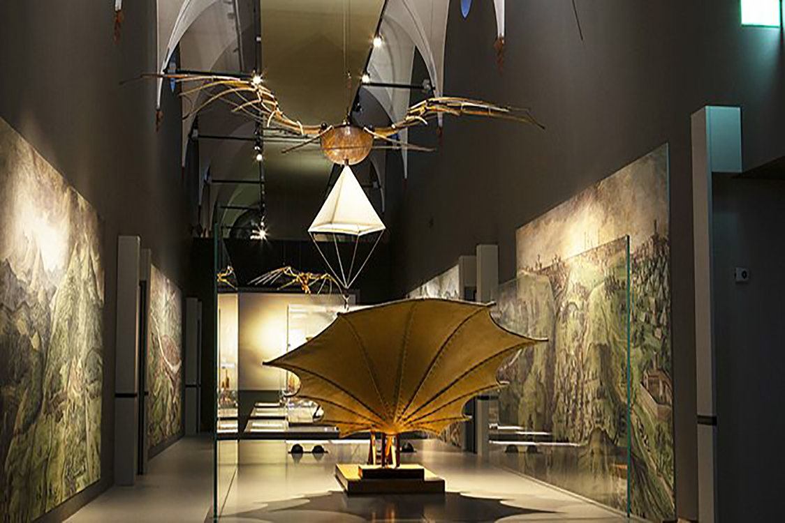 Le Nuove Gallerie Leonardo, la più grande esposizione permanente al mondo dedicata a Leonardo ingegnere, umanista e indagatore della natura, è curata da Claudio Giorgione con la collaborazione scientifica di Pietro Marani. Il percorso si snoda in modo sia cronologico che tematico e consente di seguire i diversi ambiti di studio, ricerca e applicazione a cui si è dedicato Leonardo: la formazione nella bottega del Verrocchio e il suo interesse per macchine e meccanismi nella Firenze degli ingegneri toscani; il disegno come metodo di indagine, conoscenza e comunicazione nei più diversi ambiti del sapere; i progetti d’ingegneria militare e le fantastiche declinazioni di macchine belliche della tradizione medievale; le soluzioni tecniche studiate nel corso del primo soggiorno milanese per migliorare strumenti di lavoro e produzione; gli studi sul volo a partire dall’anatomia degli uccelli; l’osservazione del territorio e delle vie d’acqua lombarde; il contributo al dibattito sull’architettura; la sua influenza nella pittura lombarda del tardo Rinascimento; infine, il pensiero della maturità che si sofferma sull’idea di un cosmo governato da leggi universali. Oltre 170 opere (70 modelli e plastici storici, 33 naturalia, 18 volumi antichi, 17 calchi, 14 affreschi e dipinti, 6 manufatti antichi, 13 facsimili storici) e 39 installazioni multimediali accompagnano per oltre 1300 mq il visitatore alla scoperta di idee, saperi e sogni che caratterizzano il pensiero di Leonardo e del Rinascimento.