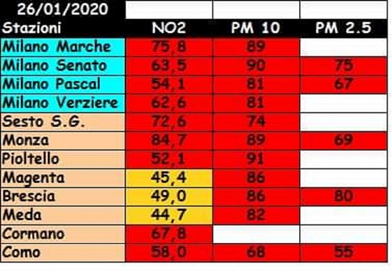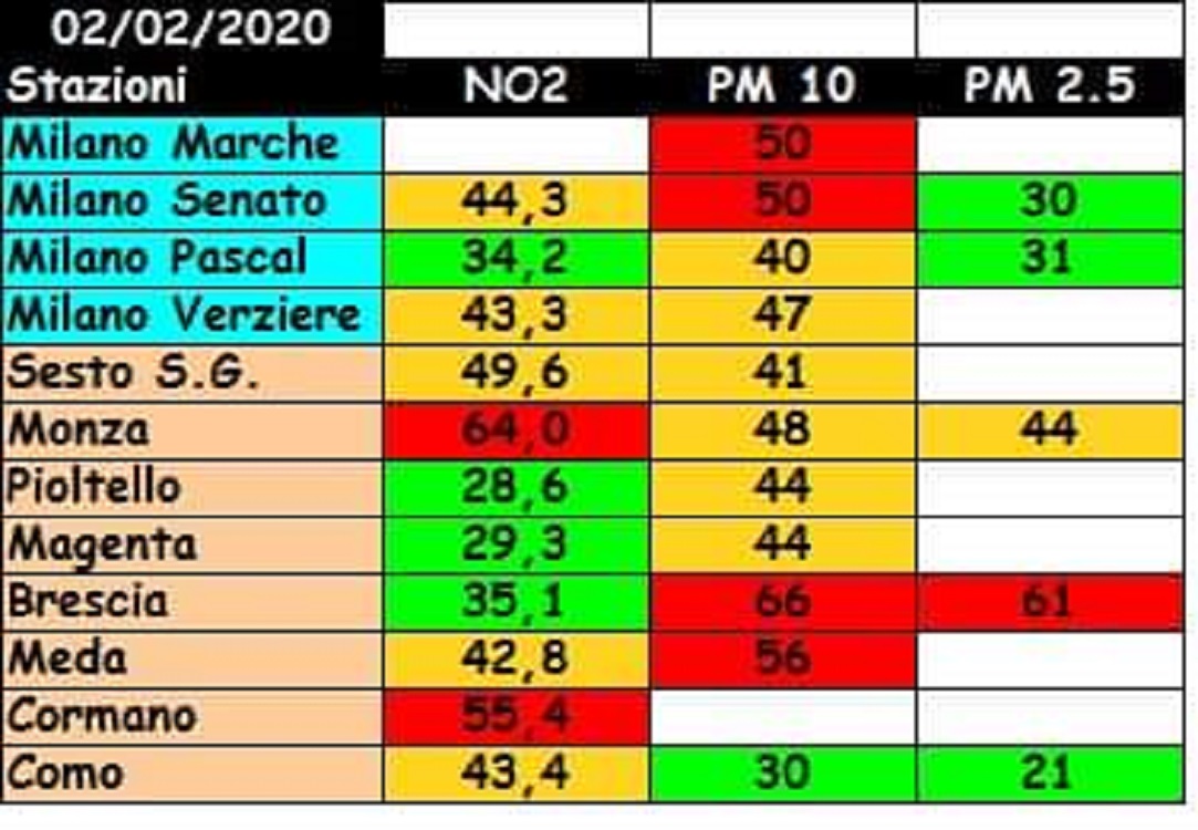 3-Granelli scrive: Milano incomincia a non essere la città più inquinata e si vede la differenza con altri territori. Domenica 2 febbraio, stesso vento, diverso traffico ed ecco i confronti: PM10: Milano città 46,7, Sesto S. Giovanni 53, Monza 48, Meda 56, Provincia di Brescia 61, Provincia di Monza e Brianza 51. NO2: Milano 53, Sesto S. Giovanni 59, Monza 78, Meda 60, Cormano 94 (sempre la maglia nera), Como 87, PM2,5: Milano 30,5, Sesto S. Giovanni 41, Monza 44, Meda 44.