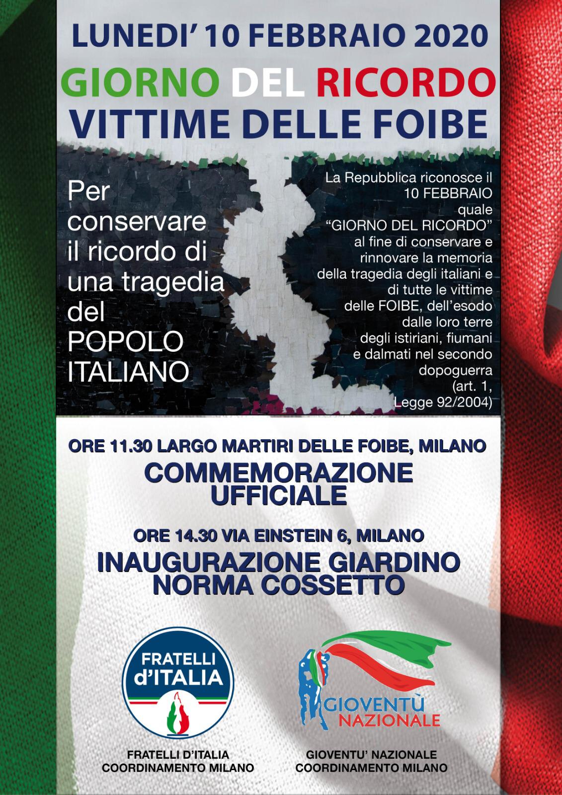 “Si svolgerà lunedì alle 11:30 in Largo Martiri delle Foibe la commemorazione ufficiale della tragedia degli italiani e di tutte le vittime delle foibe, dell’esodo dalle loro terre degli istriani, fiumani e dalmati” – ricordano, i co-coordinatori milanesi di di Fratelli d’Italia Riccardo Truppo ed Enrico Turato e Otello Ruggeri Presidente del Circolo Nord Est Milano di Fratelli d’Italia – “Sarà una straordinaria occasione di unità per tutte le forze sane del nostro paese, intenzionate a interpretare il ‘Giorno del Ricordo’ come una comune manifestazione di condanna ai crimini di guerra commessi contro gli italiani, da chiunque siano stati perpetrati”. “Noi ci saremo – annunciano – insieme a molti altri esponenti e militanti del nostro partito e ci auguriamo di non essere soli, ma accompagnati da rappresentanti di ogni schieramento politico milanese, perché – concludono – questa giornata non è solo nostra, ma di tutti quelli che amano il popolo italiano”