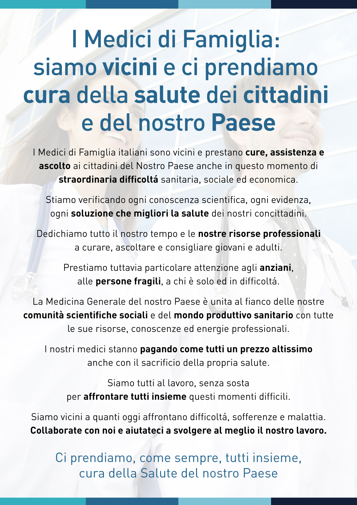 IL RUOLO DEI MEDICI DI FAMIGLIA IN QUESTO MOMENTO – I Medici di Medicina Generale – MMG ricoprono un ruolo centrale e insostituibile, in quanto conoscono la popolazione assistita e monitorano le cronicità dei loro assistiti più a rischio. Nelle mansioni dei Medici di famiglia rientrano la valutazione clinica diretta secondo le modalità più opportune ed appropriate, il controllo in remoto della aderenza terapeutica, la consultazione telefonica per la rilevazione di alcuni parametri (pressione arteriosa, modificazioni del peso corporeo, saturazione di ossigeno, ed altri), il controllo strumentale e di laboratorio secondo le necessità. Tutte queste attività sono importanti sempre, ma in particolar modo in questo periodo epidemico. “Gli elementi a disposizione dei MMG per fare prognosi rapidamente costituiscono un motivo per cui la SIMG – Società Italiana di Medicina Generale e delle Cure Primarie si è attivata per mettere a disposizione dei propri associati e di tutti i medici di medicina generale una serie di pacchetti formativi che a breve saranno disponibili su una piattaforma digitale – afferma il Prof. Cricelli, Presidente SIMG – al fine di mettere a disposizione un supporto sulle migliori modalità di gestione dei soggetti clinicamente complessi e fragili”.