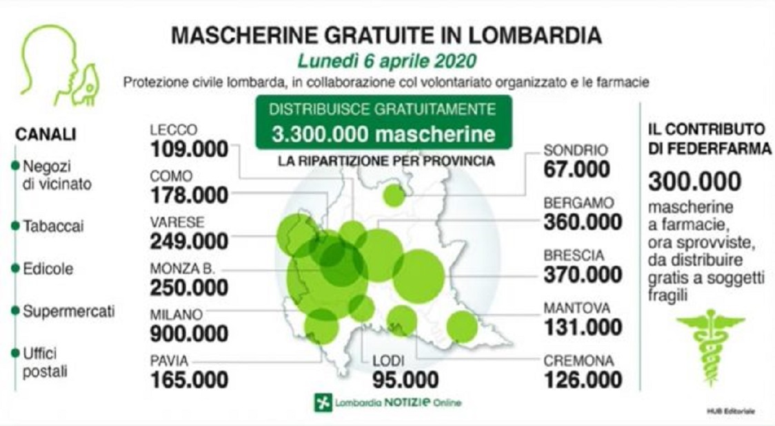 “Vi anticipo che la Protezione Civile Lombardia sta distribuendo per il territorio 3 milioni di mascherine, da domani gratuite e accessibili ai punti di distribuzione”: così ha scritto ieri in un messaggio sui social il presidente della Lombardia Attilio Fontana, che ha firmato un’ordinanza con cui si rendono obbligatorie le mascherine, o comunque protezioni su naso e bocca quando si esce di casa in regione.