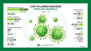 L’Assessore lombardo Davide Caparini nel quotidiano aggiornamento su Facebook ha comunicato ieri che il numero di positivi al Coronavirus nella regione è salito a 66.971 con un incremento di + 735. I nuovi tamponi processati sono stati 6.331 e il numero totale dei tamponi fatti finora 270.486. Le terapie intensive attualmente sono 901, – 21 rispetto al giorno precedente, i morti complessivi sono 12.376 con 163 nuovi decessi, i ricoverati 10.138, meno 204 rispetto a ieri. I dimessi complessivamente 43.011, + 252 rispetto al giorno prima.