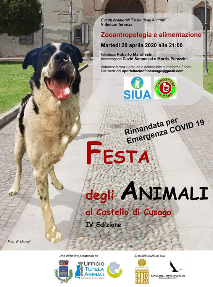 Quest’anno la IV edizione della Festa degli Animali al Castello di Cusago è rimandata per emergenza COVID-19, ma gli organizzatori della stessa: l’ Assessorato con l’Ufficio Tutela degli Animali e lo Sportello Cinofilo insieme all’associazione Banca del Tempo di Cusago e il Punto Parco La Cavetta hanno voluto mantenere vivo lo spirito della Festa. La Festa è nata nel 2017 in occasione della proclamazione da parte dell’UNESCO della ‘Giornata internazionale delle api’ fissata per il 20 di maggio. La Festa nasce con l’intenzione di accendere la nostra attenzione sul mondo animale, sia sugli animali di compagnia che sugli animali selvatici. Quest’anno non potremmo vederci in piazza, ma sono confermati alcuni eventi collaterali tra cui per martedì 28.04 la videoconferenza sulla ‘Zooantropologia e alimentazione’ a cura di SIUA e l’ass Conoscere il cane. Per info: sportellocinofilocusago@gmail.com