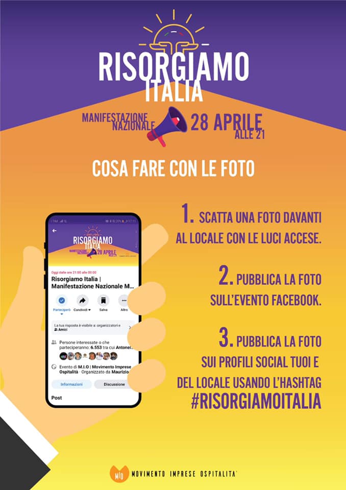 Martedì 28 aprile 2020, da nord a sud, da est a ovest, torneremo ad illuminare le strade ed i vicoli delle nostre città con l’energia positiva sprigionata dai nostri locali. Vogliamo esprimere la con un gesto simbolico la nostra volontà di tornare in piena attività. Produrre, generare occupazione e regalare emozioni sono la nostre vocazioni, assicurare un contributo produttivo al sistema paese, la nostra missione. Dalle vetrine e su i prospetti di ogni locale sarà visibile un cartello di unione ed esortazione #risorgiamoitalia. Ognuno manifesterà la propria protesta con foto, video messaggi ed atti dimostrativi al fine di sensibilizzare l’opinione pubblica alle ragioni della nostra causa comune. Il nostro rammarico è che tutto ciò potrebbe accadere per l’ultima volta.