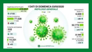In Lombardia nella giornata di ieri si sono registrati 526 casi positivi, rispetto ai 533 di sabato, e 42 decessi, rispetto ai 47 del giorno prima. Il numero totale dei positivi raggiunge quota 77.528. Crescono i pazienti ricoverati non in terapia intensiva, 6.609 (+80), mentre calano quelli in terapia intensiva arrivati a 532 (-13), rispetto ai 545 (-18) di sabato. I dimessi sono 52.773 (+417), in aumento rispetto al giorno prima quando erano 320. I tamponi totali effettuati sono arrivati a 410.857 (da sabato +7.155). I dati sono stati diffusi da Regione Lombardia.
