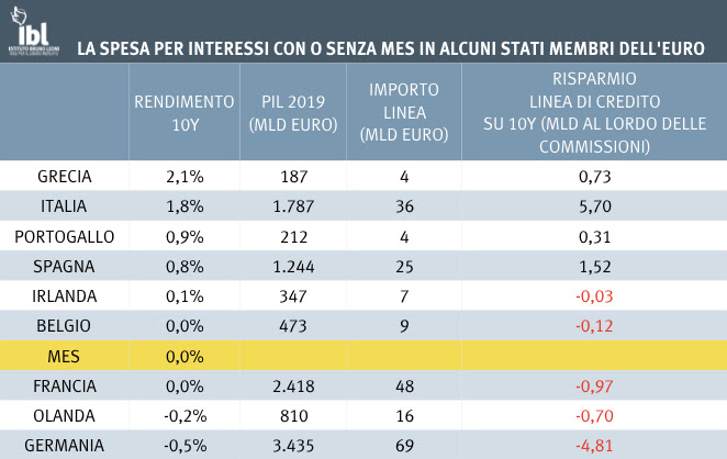 C’è anche un altro aspetto: molti si interrogano sul perché l’Italia dovrebbe ricorrere al Mes mentre altri paesi sembrano indifferenti. Anche qui, la spiegazione è semplice: perché il Belpaese è quello che dall’operazione può trarre il massimo vantaggio, per una combinazione tra la dimensione della nostra economia e il differenziale nei tassi di interesse. Nella seguente Tabella si vede una stima IBL dei risparmi dei principali paesi. Alcuni, come il Portogallo, avrebbero un vantaggio limitato; altri, come Francia e Germania, sono in grado di finanziarsi a condizioni più vantaggiose senza passare dal Mes. Solo Grecia e Spagna si trovano in una situazione comparabile alla nostra, ma l’Italia può chiedere un finanziamento molto maggiore della Grecia e deve pagare tassi di interessi superiori alla Spagna. In sintesi, il guadagno dell’Italia vale, da solo, più del doppio del risparmio congiunto degli altri paesi potenzialmente beneficiari del Mes.