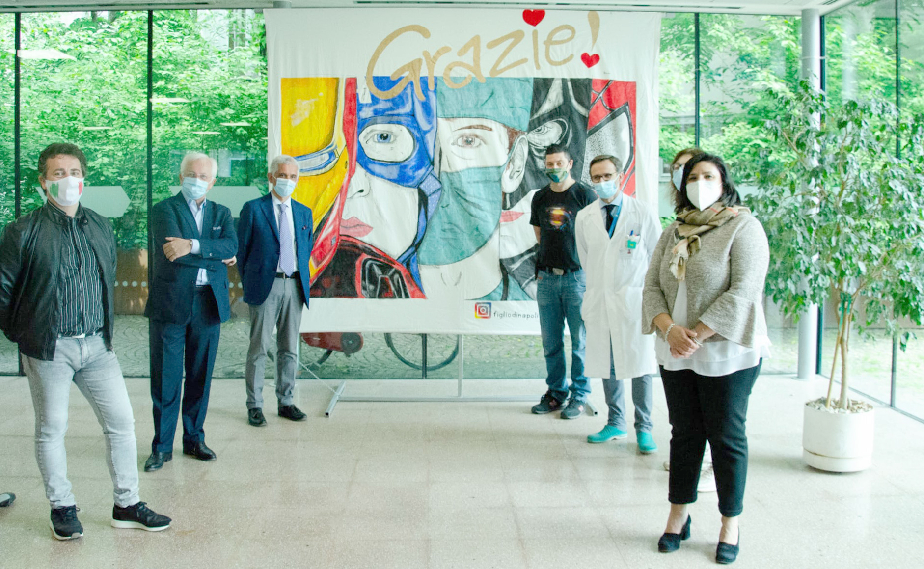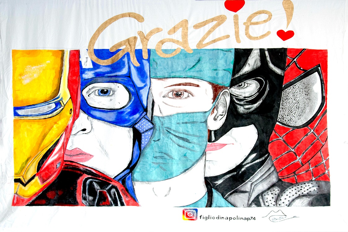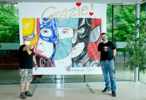È nato tutto dalla volontà di un cittadino del nostro Municipio 7, Danilo Bruno, autore di un’opera realizzata su un lenzuolo “rubato” alla moglie Franca e che rappresenta l”immagine che ha fatto il giro di tutti i web, un medico con la mascherina in mezzo ai supereroi. Durante la lunga quarantena dovuta al Coronovirus, Danilo ha realizzato questo magnifico telo, quando abbiamo vissuto i giorni più difficili e di paura. Voleva esprimere, insieme alla sua famiglia, il suo grazie a chi in quel momento stava lavorando giorno e notte in prima linea, d’altra parte li abbiamo definiti tutti i nostri supereroi, tanto da rappresentare questa bella immagine. La famiglia ha esposto per un po’ di giorni il telo sul balcone, perchè era il momento in cui si cercava di infondere fiducia e si cercava, con vari messaggi e bandiere tricolore, di comunicare la propria solidarietà e la propria fiducia. Danilo decide di donare questa sua opera all’Ospedale San Carlo, ospedale impegnando nell’emergenza Coronavirus sul nostro territorio ed esprime questo suo desiderio all’Assessore Tiziana Vecchio e il Consigliere Walter Moccia, entrambi del Municipio 7 che subito colgono questa sua bellissima iniziativa e prendono i contatti con l’Ospedale, che risponde subito positivamente. Mettono in campo tutte le sinergie e trovano un amico fabbro, il Sig.re Leo Del Grosso, che realizza in quattro e quattr’otto la struttura per esporlo e con grande piacere la dona.