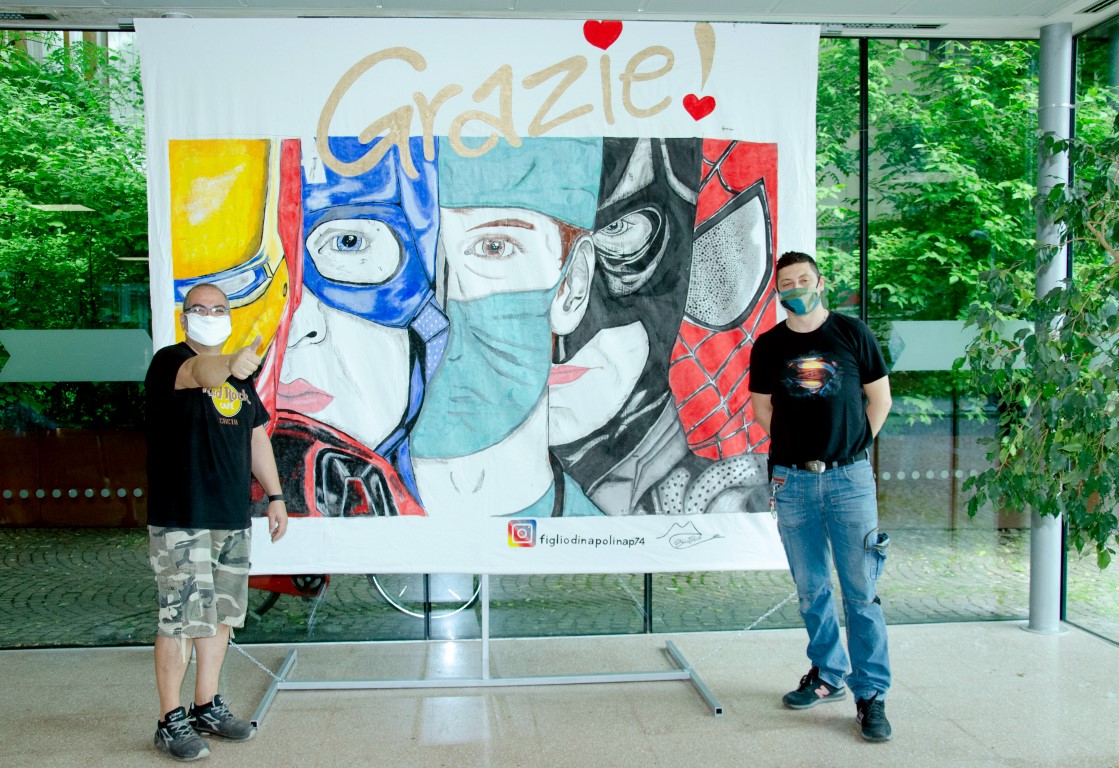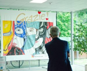 L’Assessore Tiziana Vecchio arruola anche la suocera per realizzare le finiture del telo e permettere il montaggio. Questa mattina finalmente il sogno di Danilo e della sua grande famiglia si corona, e alla presenza dello staff al completo dell’ASST Santi Paolo e Carlo, onorati della presenza del Direttore Generale Matteo Stocco, viene donato il telo che l’ospedale ha deciso di esporre, per un periodo, nell’atrio di ingresso della struttura. “Un grazie che arriva dai cittadini, che per noi vuole essere un simbolo a rappresentare tutta la cittadinanza del nostro territorio che non finirà mai di ringraziare tutte le persone che in questo lungo periodo hanno lavorato in prima linea senza mai risparmiarsi, con le proprie paure e senso di inadeguatezza, ma con tanta passione e volontà di salvare quante più vite umane” così commenta l’Assessore Tiziana Vecchio. “Abbiamo semplicemente messo in rete chi poi davvero ha permesso che tutto ciò avvenisse, tra l’altro in tempi molto ristretti. I veri protagonisti sono stati l’autore dell’opera, che ha donato, e chi l’ha ricevuta, tutti gli operatori sanitari e il personale della struttura” continua il Consigliere Walter Moccia”. Il telo rimarrà esposto per un certo periodo nell’atrio, come simbolo di ringraziamento quotidiano a chi, ancora una volta, prende servizio per prendersi cura di noi.