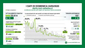 Regione Lombardia ha reso noto  che ieri i flussi provenienti dalla rete ospedaliera e le anagrafi territoriali  non hanno segnalato decessi. I nuovi casi positivi sono stati 285 (sabato 441), portano il totale a 87.110. Scendono i ricoverati in terapia intensiva -2 e quelli non in terapia intensiva – 9. I guariti sono stati +301, sabato erano stati 688.