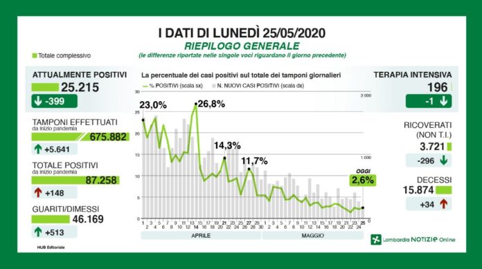 Il rapporto tra nuovi casi positivi al coronavirus e tamponi processati, in Lombardia si attesta al 2,6 per cento . Ieri i contagiati di coronavirus in Lombardia sono stati 148 per un totale 25.215, mentre sono stati 5.641 i tamponi giornalieri analizzati. Sono 34 i decessi comunicati ieri, che portano a 15.874 quelli da inizio pandemia nella regione.