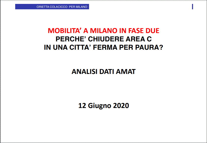 Rispetto al periodo pre covid nella prima, l’utilizzo della metropolitana è mediamente pari al meno 80% che si riduce al meno 77% in quella successiva. Siamo a un utilizzo pari al 20 – 23%, come confermato anche l’11 Giugno in Consiglio Comunale dall’Assessore Granelli. Motivo si dice essere il distanziamento. Ma a guardare meglio i dati, anche perché non ci sono code davanti alle fermate dei mezzi pubblici, si potrebbe pensare che le persone non siano costrette, ma preferiscano spostarsi con altri mezzi, perché ci sarebbe posto per almeno un 7-10% in più. Mezzi che siano biciclette, scooter, monopattini e automobili. E solo un incremento esponenziale di queste potrebbe giustificare la riaccensione delle telecamere di Area C, dove entrano bus turistici, taxi, veicoli assoggettabili al pagamento, veicoli di servizio, residenti. Posto che i bus turistici purtroppo non ci sono e registrano un meno 100%, va analizzato come viene distribuito il peso di ingresso. I veicoli di servizio dal 18 al 22 erano a meno 14%, mentre dal 25 al 29 sono a meno 13%. Il taxi il mezzo sostitutivo per eccellenza non viene assolutamente utilizzato, tanto che passa da un meno 73% nella prima settimana in considerazione al meno 71% nella seconda e va sottolineato che fra mattino e sera c’è una differenza ancora più netta nelle ore serali dove il delta negativo raggiunge anche meno 86%. Una categoria questa da sostenere con la creazione di voucher e di convenzioni per anziani, diversamente abili e operatori sanitari, aspetti sul piatto sia in Regione che in Comune. Vanno invece considerati i dati dei veicoli assoggettabili al pagamento. E partiamo dall’11 Maggio al 15 Maggio, dove si registra un meno 17% totale di cui al mattino meno 6% e la sera meno 53,40% Dal 18 al 22 Maggio si registra nel totale un meno 3,60% in totale, di cui la sera un negativo 35,20%, mentre al mattino già si vede un incremento del più 3,80%; dal 25 al 29 cresce ancora il numero dei veicoli che entrano in area C che toccano un più 4,60% con al mattino più 10,60% e la sera meno 15,80%. Il che vuole dire che sono ingressi di necessità, che si rientra prima dell’ora di punta, che in serata tardi non ci si muove affatto. E ancora é bene analizzare gli ingressi dei residenti: dal 18 al 22 si registra un meno 28% in totale, di cui meno 10,40% al mattino e la sera meno 37,20%. Dal 25 al 29 c’è ancora un meno 24% in totale di cui meno 5,80% al mattino e meno 33,20% la sera. Che vuole dire che ci si muove poco, probabilmente si va a piedi. Che cosa cambierebbe ora prolungare Area C, visto che l’auto è il mezzo considerato in assoluto più sicuro da quei pochi che si muovono? E perché almeno non lasciare questa possibilità alle persone più fragili degli anziani e dei diversamente abili? Stiamo parlando di oggi quando non impattano 150.000 studenti universitari, gli allievi di ogni ordine di scuola, le persone in smart working, i turisti, i visitatori per business, grandi eventi e fiere. Ma bisogna chiedersi perché le persone non si muovono, se non ci sono, o stanno in casa per cautela e prudenza, o perché hanno paura? Questo è il punto, con pregiudizio sul comparto del commercio, della ristorazione, del tempo libero, dei teatri, dei cinematografi. Se il sentimento è questo non si riempiranno i mezzi pubblici, si sceglieranno mezzi individuali, scooter, monopattini, bici. E anche qui lo sharing segna dati da interpretare. Il car sharing è il meno apprezzato e segna fra il 18 e il 22 un meno 63,20% e dal 25 al 29 un meno 60,20%. Lo scooter sharing dal 18 al 22 meno 58,40% e dal 25 al 29 meno 46%. Al contrario piacciono sempre più i monopattini che passano da meno 38,20% dal 18 al 22 Maggio al più 55,80% dal 25 al 29. Il bike sharing non riscuote un grande consenso e dal 18 al 22 segna un meno 53,40% che si riduce a meno 43,60% dal 25 al 29. Sarebbe interessante capire se i 6.000 ciclisti che percorrono la ciclabile Corso Venezia Buenos Aires usano biciclette di proprietà o in sharing. Comunque non si può pensare che 6.000 ciclisti risolvano il problema di Milano. Le piste ciclabili possono, se fatte bene, migliorare la situazione e alleggerire il traffico, ma bisogna calcolare che a Milano piove per 119 giorni all’anno, che non stiamo parlando del movimento di 10.000 persone ma di 1.190.000 persone, che sarebbero lasciate a terra dai mezzi pubblici, visto che in città la metropolitana trasporta 1.200.000 passeggeri al giorno e i mezzi di superficie 500.000 per un totale di 1.700.000 e Trenord 600.000 passeggeri al giorno. Bisogna valutare anche il loro costo e considerare che lo stanziamento per le ciclabili verrà sottratto da quello per la riparazione delle buche, che era, visto l’alto numero degli interventi di manutenzione prevedibili, di quarantanove milioni di euro, poi già ridotto del 20%. Le ciclabili sono in sola segnaletica, come Corso Venezia, Buenos Aires, Viale Monza, in struttura e in segnaletica, come da Legioni Romane a Berna e Zurigo e in struttura in Via Monterosa da Piazza Buonarroti a Piazza Amendola. Sono “solo” 35 chilometri, ma sarebbe opportuno avere un’idea precisa del costo finale. In sola segnaletica le ciclabili costano euro ottomilacinquecento al chilometro, in struttura duecentocinquantamila, ma non si sa quanto costano quelle miste. Quindi non si capisce di quale spesa si sta parlando. Da circa trecentomila euro a quanti milioni? Così quante buche rimarranno come sono, mettendo a rischio proprio gli scooteristi e i ciclisti, che, secondo i dati ACI Istat 2017 da noi presentati, negli incidenti stradali con lesioni gravi causati da buche sono il 64,76% i primi e nel 18,21% i secondi?