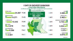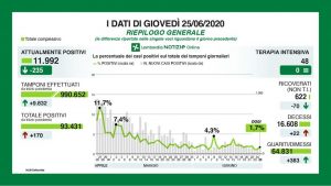 E’ risultato dell 1,7% (rispetto allo 0,97 % di mercoledì) il rapporto tra nuovi casi positivi al coronavirus e tamponi processati in Lombardia. I nuovi casi ieri sono stati 170 di cui 53 a seguito di test sierologici effettuati a Bergamo e 84 ‘debolmente positivi’, su 9.832 tamponi eseguiti. I decessi sono stati 22, in tutto 16.608 da inizio pandemia. I nuovi guariti/dimessi da mercoledì sono 383 e le persone in terapia intensiva sono 48, come mercoledì, 622 i pazienti in terapia non intensiva (-70). Da inizio pandemia hanno contratto il virus 93.431 cittadini lombardi e sono stati 990.652 tamponi.
