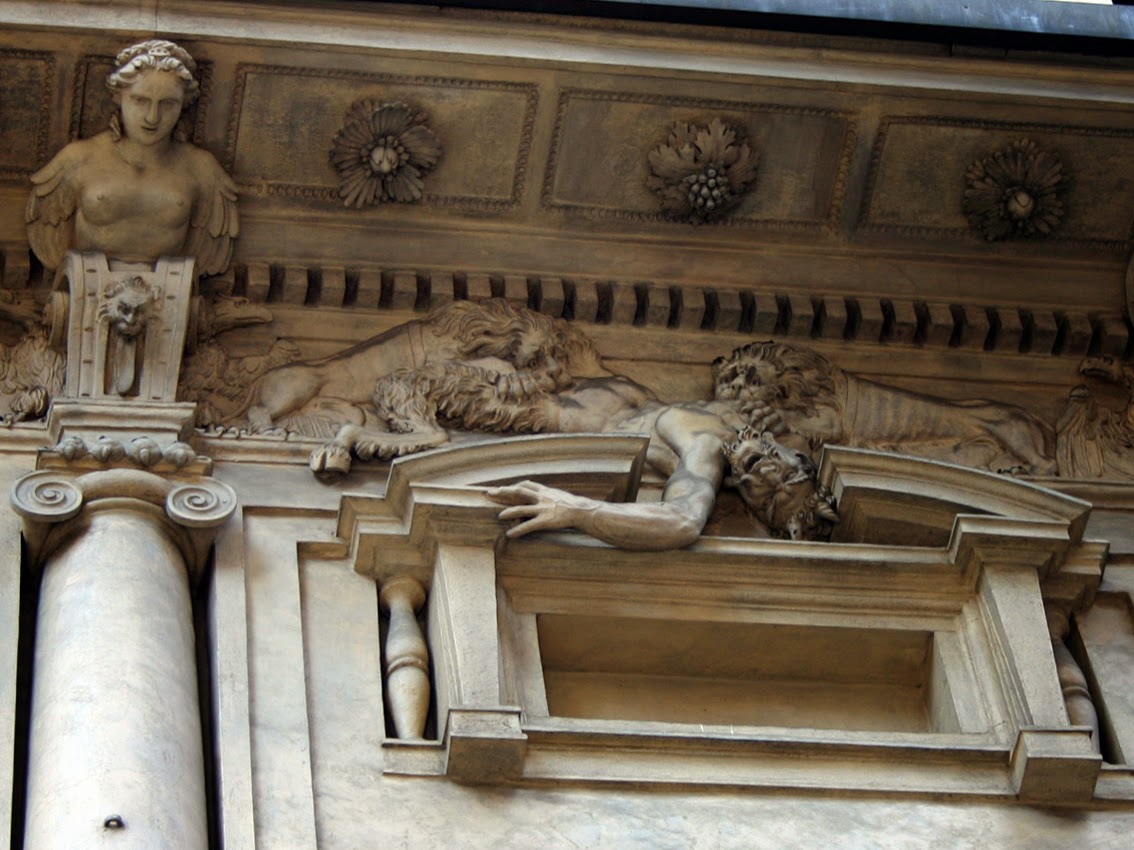 Uno di questi è la Casa degli Omenoni (dal dialetto milanese ‘grandi uomini’) così chiamata per la facciata in cui ‘dimorano’ otto telamoni (versione maschile delle Cariatidi) che raffigurano altrettanti barbari sconfitti. Ubicata al civico numero 3 di una omonima piccola via che congiunge piazza Belgioioso a via Case Rotte (nei pressi della Scala), nella contrada anticamente detta del Morone. Edificata nel Cinquecento, nel 1565 ne divenne proprietario l’aretino Leone Leoni cesellatore e scultore, dalla vita singolare e avventurosa, che lavorò nelle più importanti corti europeee: a Venezia come orefice e medaglista, a Roma presso la zecca di papa Paolo III Farnese dove divenne amico di Michelangelo; a MIlano dal 1542 dove incise le monete della zecca fino a tarda età. L’incarico più prestigioso lo ebbe dall’imperatore Carlo V che lo chiamò a Bruxelles incaricandolo di celebrare la sua vittoria sui protestanti a Muhlberg: Leoni eseguì una statua in bronzo a grandezza naturale che mostra l’imperatote che incatena il Furore (oggi al Museo del Prado). Carlo V d’Asburgo ne rimase così affascinato tanto da regalare all’artista un titolo nobiliare e questo palazzo del centro di Milano che Leoni scelse come abitazione sua e del figlio, restaurandolo e arricchendo la facciata con otto telamoni in pietra. Padre e figlio, mercanti d’arte e celebri collezionisti, realizzarono un’eclettica collezione d’arte con opere di Tiziano, Correggio, calchi in gesso di statue classiche, e addirittura un complesso di disegni di Leonardo, costituenti l’attuale Codice Atlantico, conservato alla pInateca Ambrosiana.
