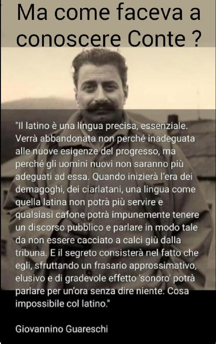 Giocando un po’, si scopre che le persone geniali possono essere preveggenti illustrando un futuro con intenzioni satiriche, ma non troppo. La verità è che un attento esame dell’evolversi della storia umana, porta a deduzioni limpide, quasi descrittive. E’ così per il geniaccio di Giovanni Guareschi che prefigura un “demagogo cialtrone” davvero molto simile a Conte, alla sua logorrea vuota di contenuti, alla capacità di usare i media per apparire. Impietoso ritratto, forse, ma così verosimile…