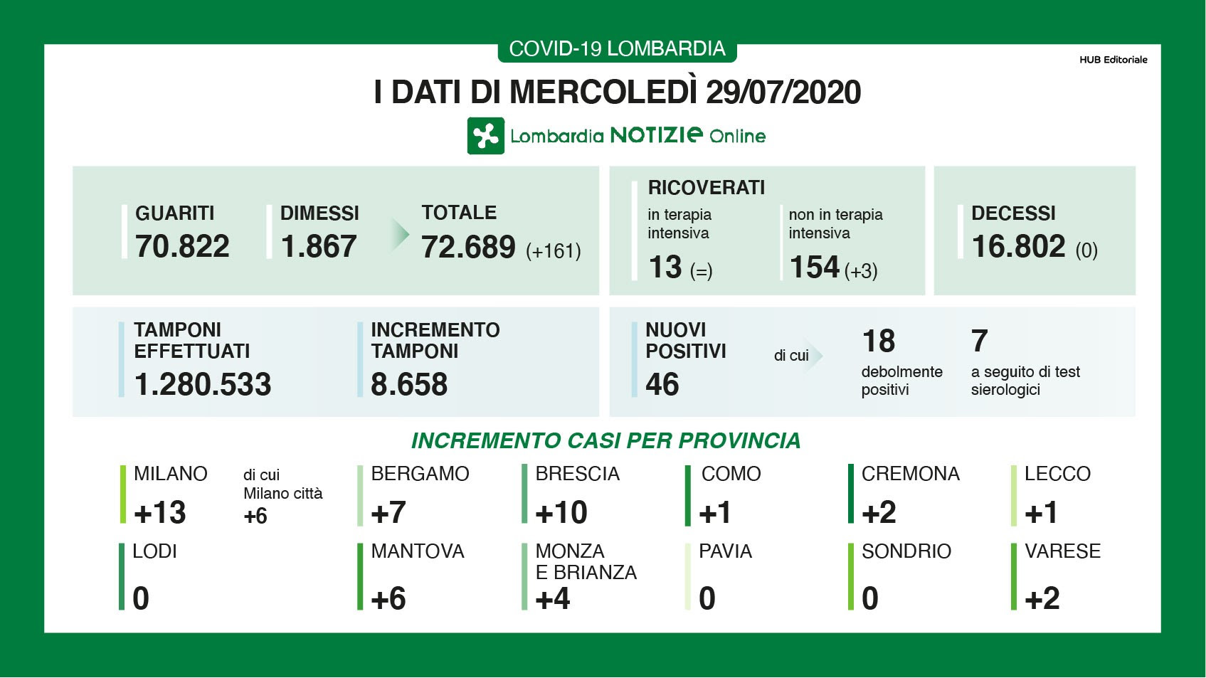 I nuovi casi di positività al coronavirus in Lombardia ieri sono stati 46 di cui 18 ‘debolmente positivi’ e 7 a seguito di test sierologici a fronte di 8.658 tamponi eseguiti. Non sono registrati nuovi decessi. I nuovi guariti/dimessi da martedì sono stati 161 e le persone che si trovano in terapia intensiva sono rimaste 13. Sono 154 (+3) i pazienti attualmente ricoverati non in terapia intensiva. Da inizio pandemia sono stati eseguiti 1.280.533 tamponi. Nelle province di Lodi, Pavia e Sondrio non si sono registrati nuovi casi di contagio.