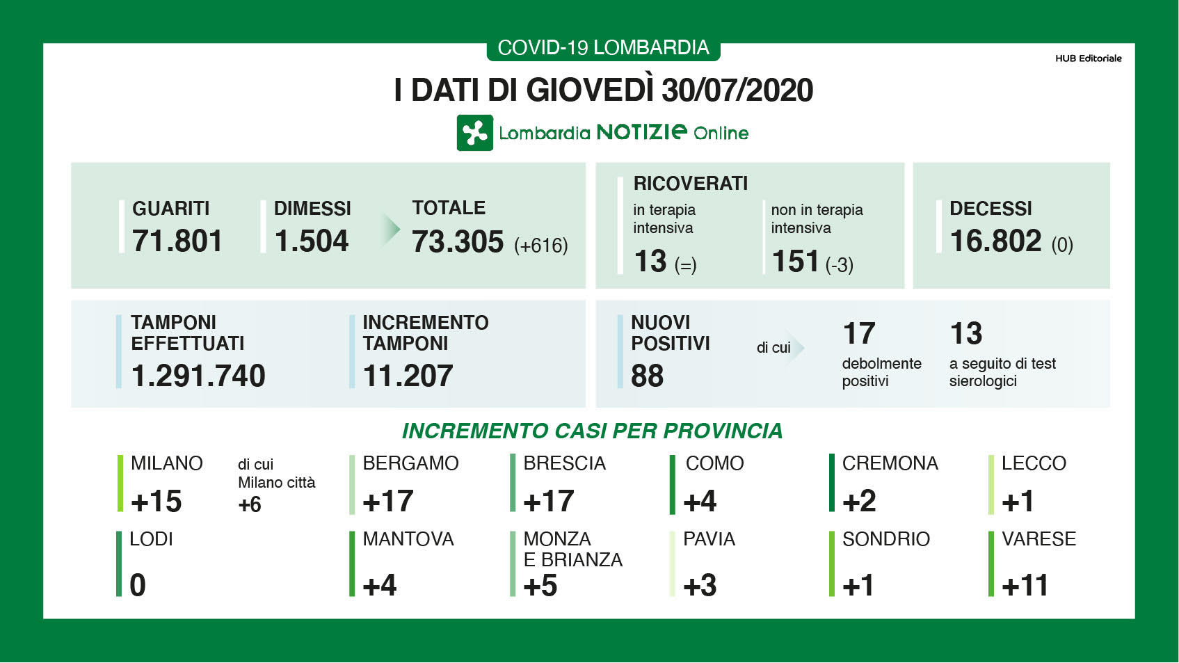 I nuovi casi in Lombardia sono stati 88 di cui 17 ‘debolmente positivi’ e 13 a seguito di test sierologici a fronte di 11.207 tamponi eseguiti. Anche ieri non si sono registrati nuovi decessi. I nuovi guariti/dimessi da mercoledì sono 616 e le persone che si trovano in terapia intensiva sono ancora 13. Sono 151 (-3) i pazienti attualmente ricoverati non in terapia intensiva. Da inizio pandemia sono stati eseguiti 1.291.740 tamponi. Nelle province di Lodi, Pavia e Sondrio non si sono registrati nuovi casi di contagio.