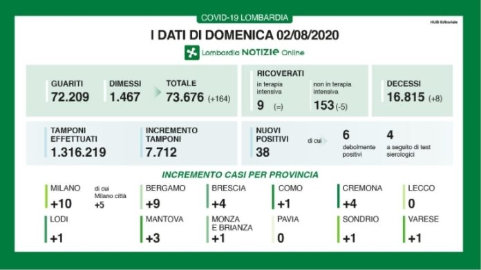 In Lombardia invece i nuovi casi sono stati 38 (di cui 6 ‘debolmente positivi’ e 4 a seguito di test sierologici). I guariti/dimessi sono in totale 73.676 (+164) (72.209 guariti e 1.467 dimessi)