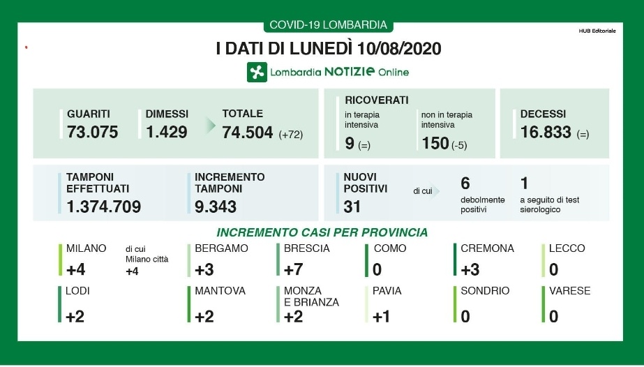 I nuovi casi in Lombardia sono stati 31 di cui 6 ‘debolmente positivi’ e 1 a seguito di test sierologico a fronte di 9.343 tamponi effettuati. Non si sono registrati nuovi decessi. I nuovi guariti/dimessi da domenica sono stati 72, le persone in terapia intensiva sono rimaste 9. Sono 162 (-8 ) i pazienti attualmente ricoverati non in terapia intensiva. Da inizio pandemia sono stati eseguiti 1.374.709 tamponi.