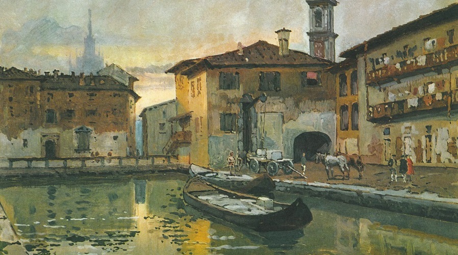 cielo di Arturo Ferrari (1861 – 1932), pittore milanese, che ha saputo raccontare nelle sue opere le trasformazioni urbanistiche e culturali, dall’ottocento al novecento, di una Milano rappresentativa di un mondo in dissolvenza, in continua evoluzione. E il suo sguardo ha la tenerezza dell’evocazione poetica, il realismo dell’attenzione, la sensibilità per il quotidiano. E i colori stemperati, morbidi, restituiscono un’atmosfera trasfigurata dall’emozione, dalla nostalgia. E la cura dei particolari impreziosisce i dettagli, rende vivo l’insieme, caratterizza il tempo di un quotidiano che non c’è più. E traspare l’ amore per una Milano lirica, quasi sospesa, costruita a misura d’uomo, pur nell’imponenza dei suoi monumenti e delle sue Chiese.