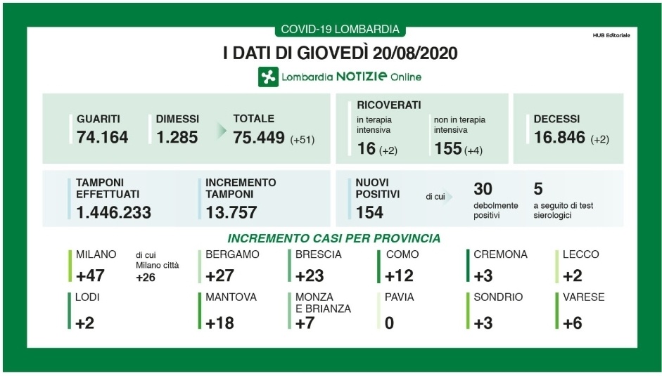 I nuovi casi in Lombardia sono stati 154 di cui 30 ‘debolmente positivi’ e 5 a seguito di test sierologico a fronte di 13.757 tamponi effettuati. Si sono registrati 2 nuovi decessi. I nuovi guariti/dimessi da mercoledì sono stati 51, le persone in terapia intensiva sono 16, due in più mercoledì. Sono 155 (+4) i pazienti attualmente ricoverati non in terapia intensiva. Da inizio pandemia sono stati eseguiti 1.446.233 tamponi.