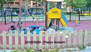 Si appropriano delle panchine per dormire e purtroppo anche dell’area giochi dei bimbi che è diventata un’accampamento di sacchi a pelo, con parcheggio per le bici e angolo wc.