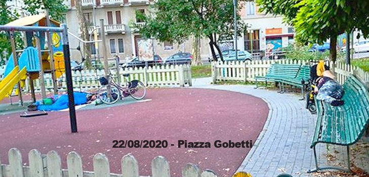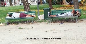 Si appropriano delle panchine per dormire e purtroppo anche dell’area giochi dei bimbi che è diventata un’accampamento di sacchi a pelo, con parcheggio per le bici e angolo wc.