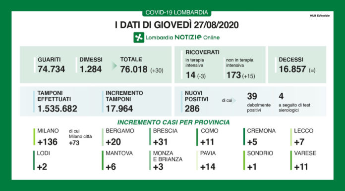 In Lombardia i nuovi casi sono stati 286, di cui 39 ‘debolmente positivi’ e 4 a seguito di test sierologico, a fronte di 17.964 tamponi effettuati. Non si sono registrati nuovi decessi per il quarto giorno consecutivo. I nuovi guariti/dimessi da mercoledì sono stati 30, le persone in terapia intensiva sono 14 (-3). Sono 173 i pazienti attualmente ricoverati non in terapia intensiva, 15 più di mercoledì. Da inizio pandemia sono stati eseguiti 1. 535.682 tamponi.