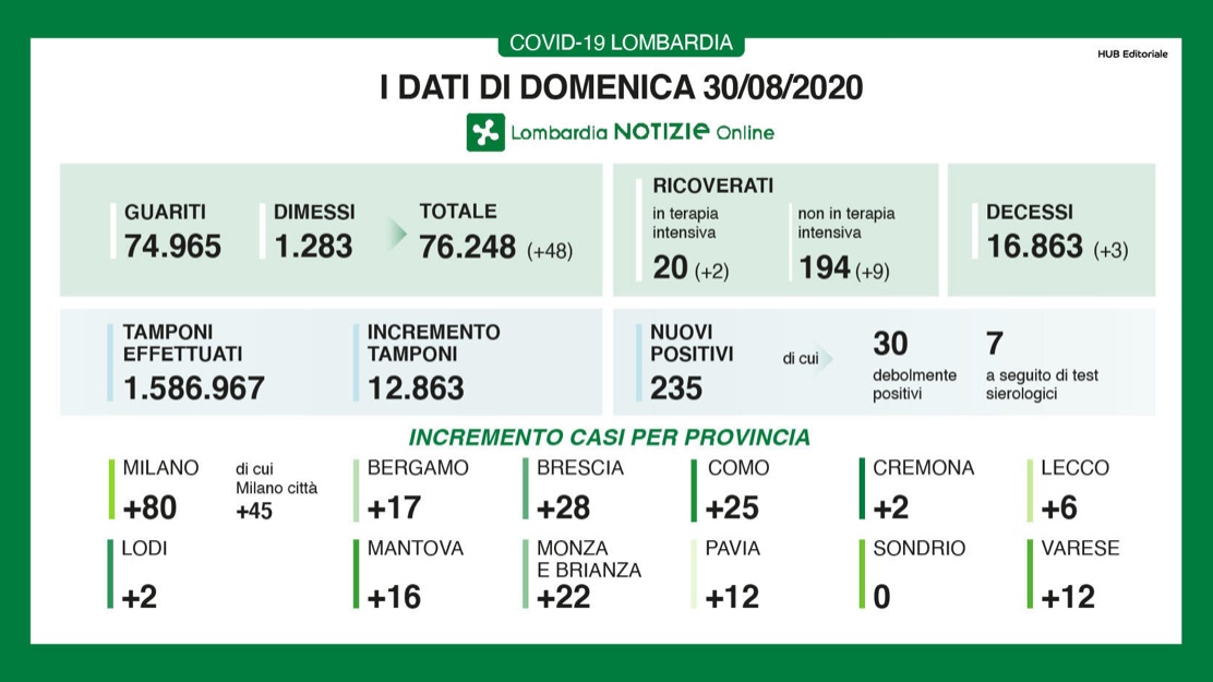 I nuovi casi in Lombardia sono invece stati 235 (di cui 30 ‘debolmente positivi’ e 7 a seguito di test sierologico) a fronte di 12.863 tamponi effettuati.