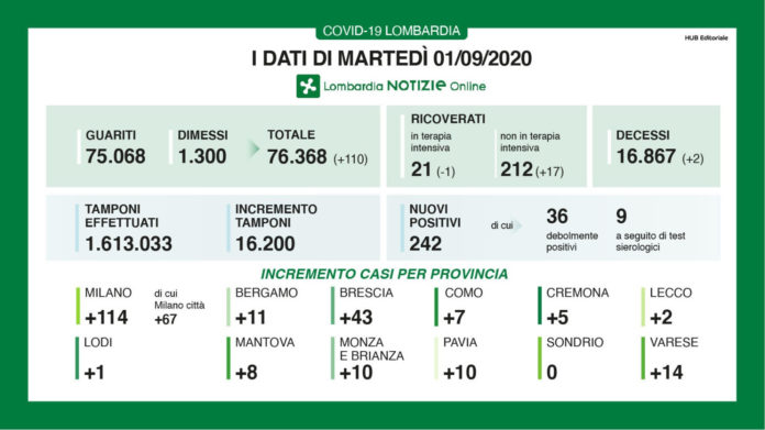 I nuovi casi di positività al coronavirus ieri in Lombardia sono stati 242, di cui 36 ‘debolmente positivi’ e 9 a seguito di test sierologico, a fronte di 16.200 tamponi effettuati per un rapporto dell’1,49%. Si sono registrati due decessi.
