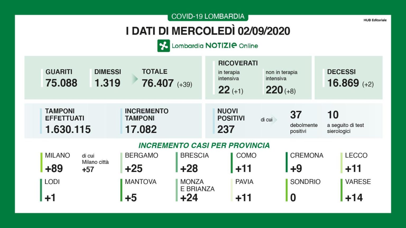 I nuovi casi in Lombardia sono stati 237 di cui 37 ‘debolmente positivi’ e 10 a seguito di test sierologici, a fronte di 17.082 tamponi effettuati per un rapporto dell’1,38%. Si sono registrati due nuovi decessi. I nuovi guariti/dimessi da martedì sono stati 39, le persone in terapia intensiva sono 22 (+1). Sono 220 i pazienti attualmente ricoverati non in terapia intensiva (+8). Da inizio pandemia sono stati eseguiti 1.630.115 tamponi.