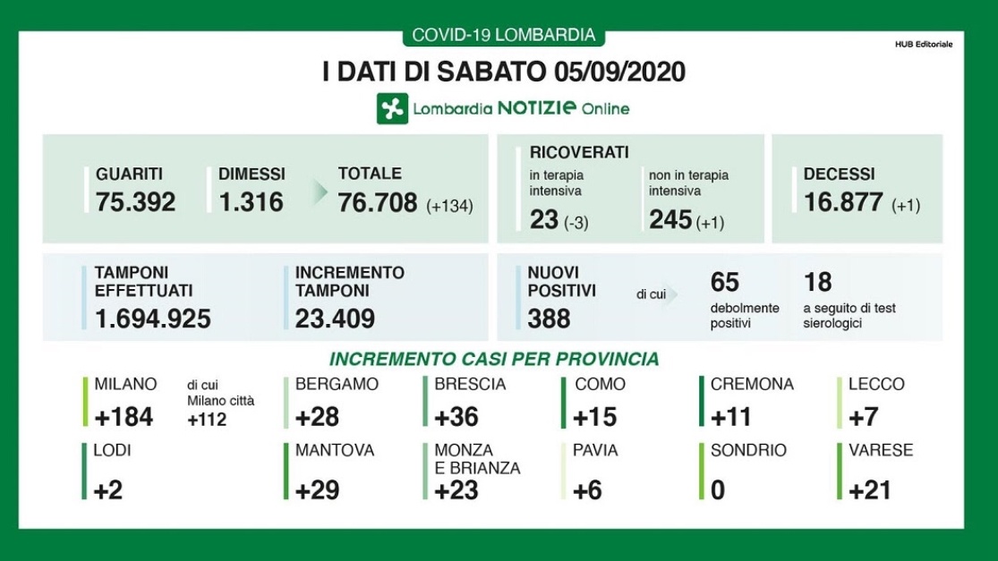 I nuovi casi in Lombardia sono stati 388 di cui 65 ‘debolmente positivi’ e 18 a seguito di test sierologico, a fronte di 23.409 tamponi effettuati per un rapporto dell’1,65%. Si registra un nuovo decesso. I nuovi guariti/dimessi da venerdì sono stati 134, le persone in terapia intensiva sono 23, (-3). Sono 245 i pazienti attualmente ricoverati non in terapia intensiva (+1). Da inizio pandemia sono stati eseguiti 1.694.925 tamponi.