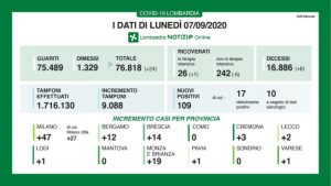 I nuovi casi in Lombardia sono stati 109 di cui 17 ‘debolmente positivi’ e 10 a seguito di test sierologico, a fronte di 9.088 tamponi effettuati per un rapporto dell’1,19%. Si sono registrati 6 nuovi decessi. I nuovi guariti/dimessi da domenica sono stati 24, le persone in terapia intensiva sono 26 (+1). Sono 242 i pazienti attualmente ricoverati non in terapia intensiva (-6 ). Da inizio pandemia sono stati eseguiti 1.716.130 tamponi.