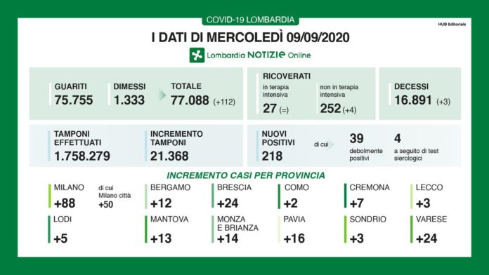 I nuovi casi in Lombardia sono stati 218 di cui 39 ‘debolmente positivi’ e 4 a seguito di test sierologico, a fronte di 21.368 tamponi effettuati per un rapporto dell’1,02%. Si sono registrati tre nuovi decessi.