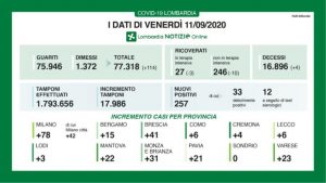 I nuovi casi in Lombardia sono stati 257 di cui 33 ‘debolmente positivi’ e 12 a seguito di test sierologico, a fronte di 17.986 tamponi effettuati per un rapporto dell’1,42%. Si sono registrati 4 nuovi decessi.