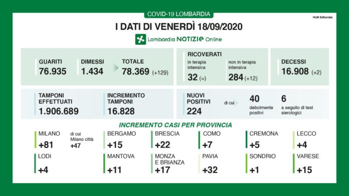 I nuovi casi in Lombardia sono stati 224 di cui 40 ‘debolmente positivi’ e 6 a seguito di test sierologico a fronte di 16.828 tamponi effettuati per un rapporto dell’1,33%. Si registrano due decessi. I nuovi guariti/dimessi da giovedì sono stati 129, le persone in terapia intensiva sono rimaste 32. Sono 284 i pazienti attualmente ricoverati non in terapia intensiva, (+12).
