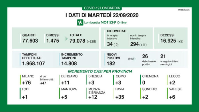 I nuovi casi in Lombardia sono stati 182 di cui 26 ‘debolmente positivi’ e 21 a seguito di test sierologico a fronte di 14.808 tamponi effettuati per un rapporto dell’1.22%. Si sono registrati due nuovi decessi.