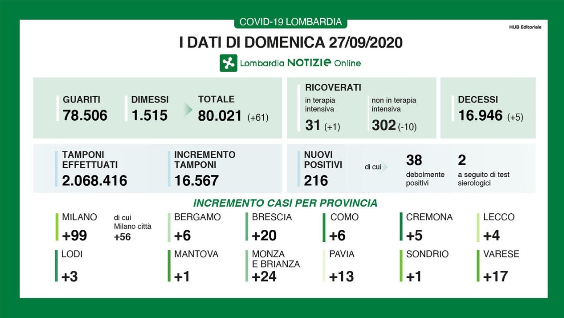 – i nuovi casi positivi: 216 (di cui 38 ‘debolmente positivi’ e 2 a seguito di test sierologico)