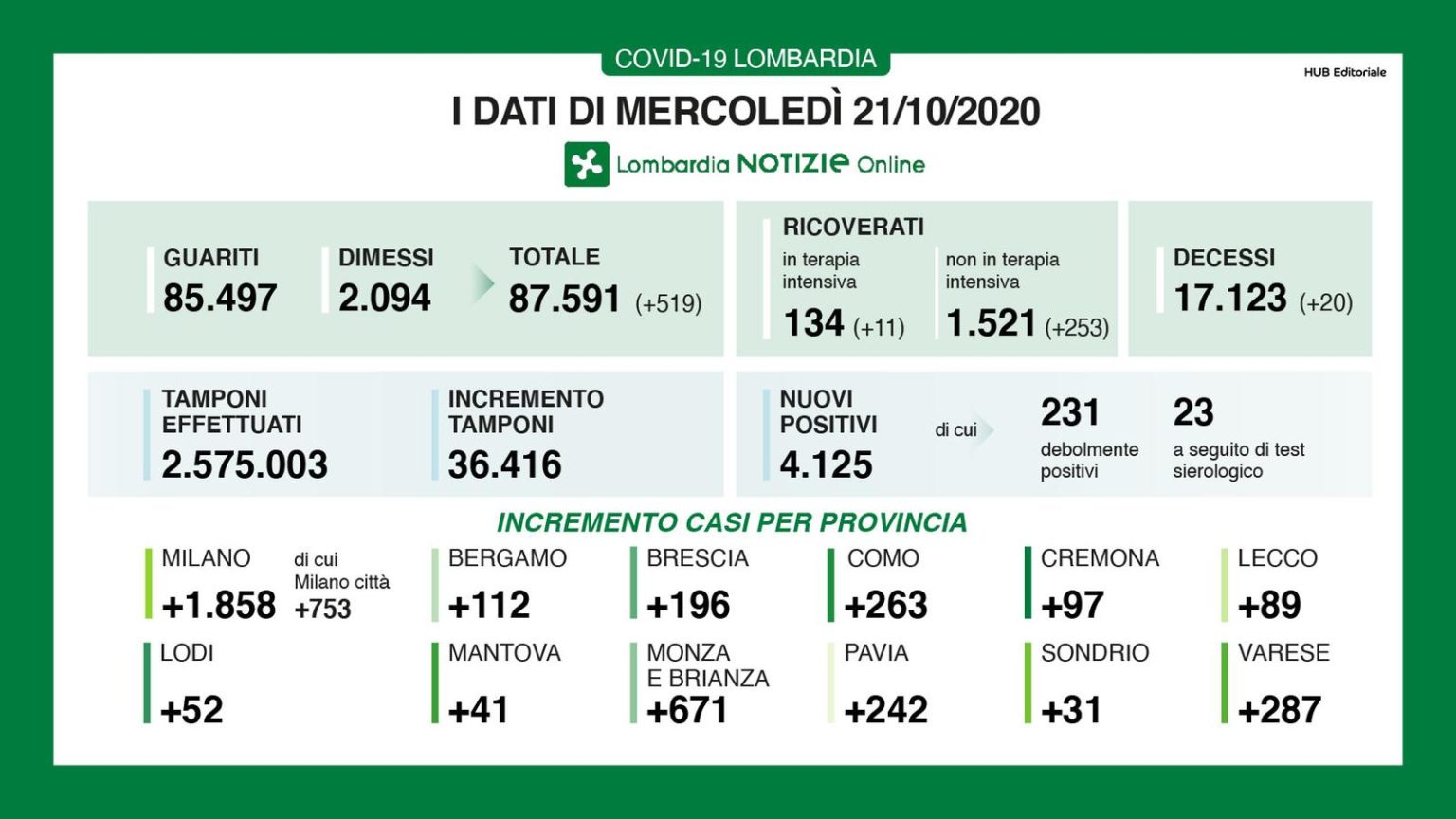 I nuovi casi in Lombardia sono 4.125 di cui 231 ‘debolmente positivi’ e 23 a seguito di test sierologico, a fronte di 36.416 tamponi effettuati per un rapporto del 11.3 %. Si sono registrati 20 nuovi decessi.