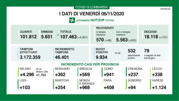 I nuovi casi in Lombardia sono stati 9.934 (di cui 532 ‘debolmente positivi’ e 79 a seguito di test sierologico), a fronte di 46.401 tamponi effettuati per un rapporto del 21,4%. Si sono registrati 131 nuovi decessi.
