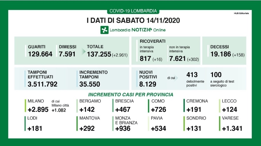 I nuovi casi di positività in Lombardia sono stati 8.129 di di cui 413 ‘debolmente positivi’ e 100 a seguito di test sierologico, a fronte di 35.550 tamponi effettuati per un rapporto del 22,8%. Si sono registrati 158 nuovi decessi.