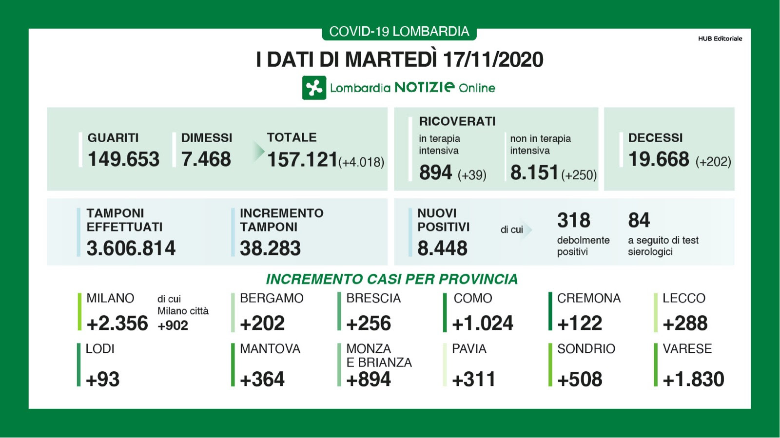 I nuovi casi in Lombardia sono stati 8.448 (di cui 318 ‘debolmente positivi’ e 84 a seguito di test sierologico), a fronte di 38.283 tamponi effettuati per un rapporto del 22%. Si sono registrati 202 nuovi decessi.