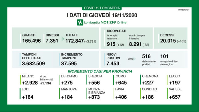 I nuovi casi in Lombardia sono stati 7.453 (di cui 516 ‘debolmente positivi’ e 101 a seguito di test sierologico), a fronte di 37.595 tamponi effettuati per un rapporto del 19,8%. Si sono registrati 165 nuovi decessi.