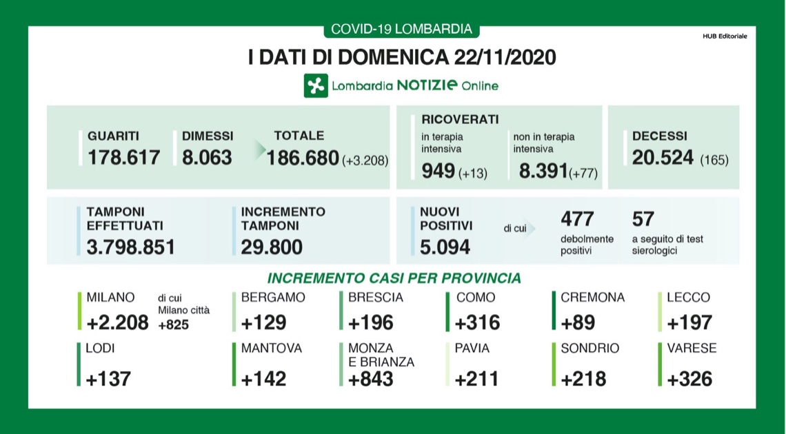 I nuovi casi in Lombardia sono stati 5.094 di cui 477 ‘debolmente positivi’ e 57 a seguito di test sierologico, a fronte di 29.800 tamponi effettuati. Si sono registrati 165 nuovi decessi (per un totale complessivo di 20.524)