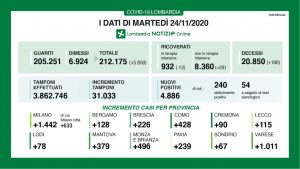 I nuovi casi in Lombardia sono stati 4.886 di cui 240 ‘debolmente positivi’ e 54 a seguito di test sierologico, a fronte di 31.033, tamponi effettuati per un rapporto del 15.7%. Si sono registrati 186 nuovi decessi.
