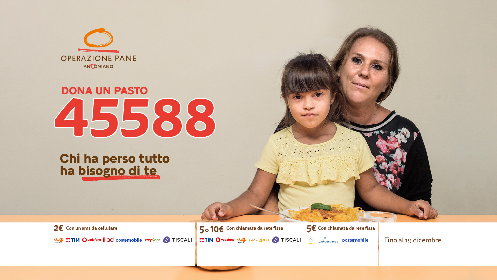 Per garantire un pasto caldo e un aiuto concreto alle migliaia di persone che ogni anno vengono accolte dalle 15 realtà francescane di “Operazione Pane” l’Antoniano ha lanciato una campagna sms solidale che sarà attiva fino al 19 dicembre. Per offrire un contributo basta inviare un sms o fare una telefonata da rete fissa al numero solidale 45588.
